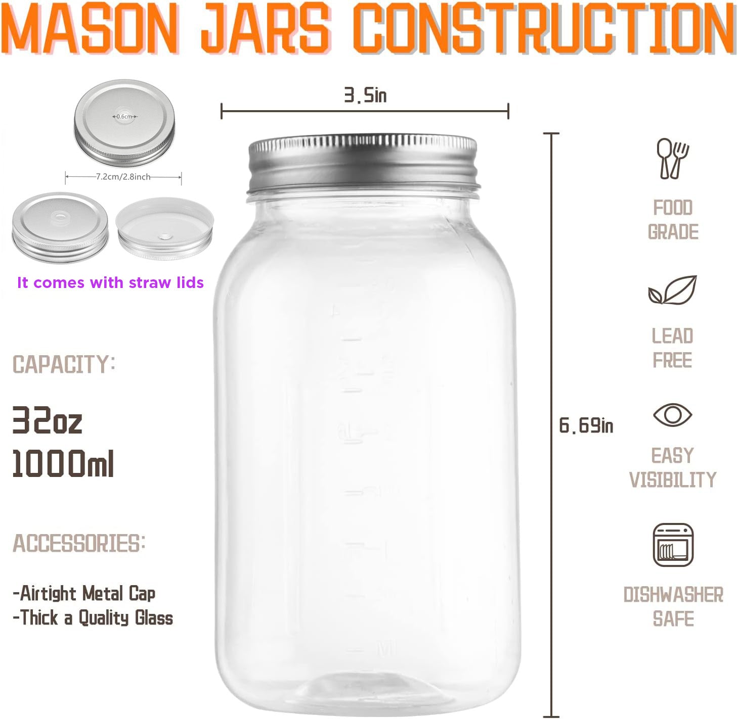 - Large Capacity & Space-Saving : Includes 1 of 32 oz(1 Litter) clear glass jars with 1 sleek metal lid & 1 straw lid