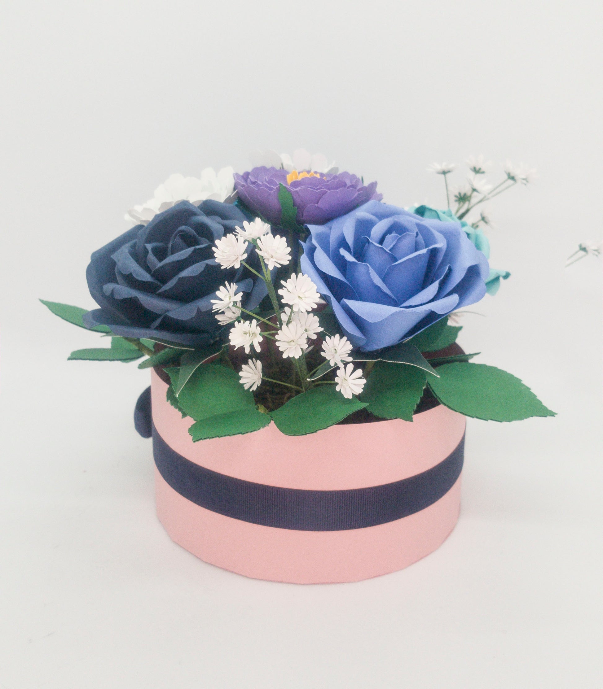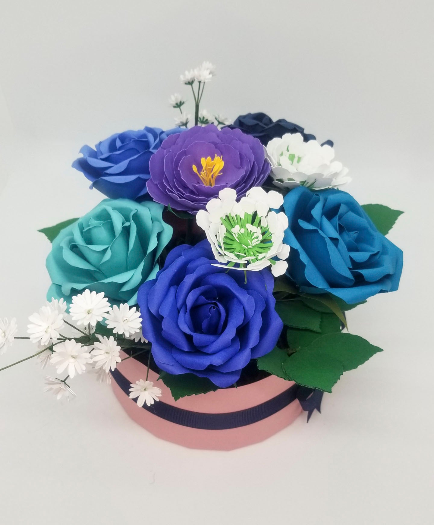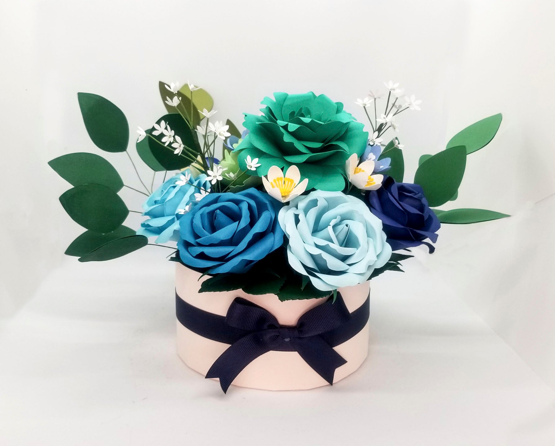 A small & beautiful paper flower arrangement in a handmade box style. It is a perfect any occasions, decorations, centrepieces, a gift to love ones or just for the home. If you want to customize the colors of the flowers, This is the right site that you entered :) It has 5 big paper roses, 1 peony, baby breath with eucalyptus leaves.