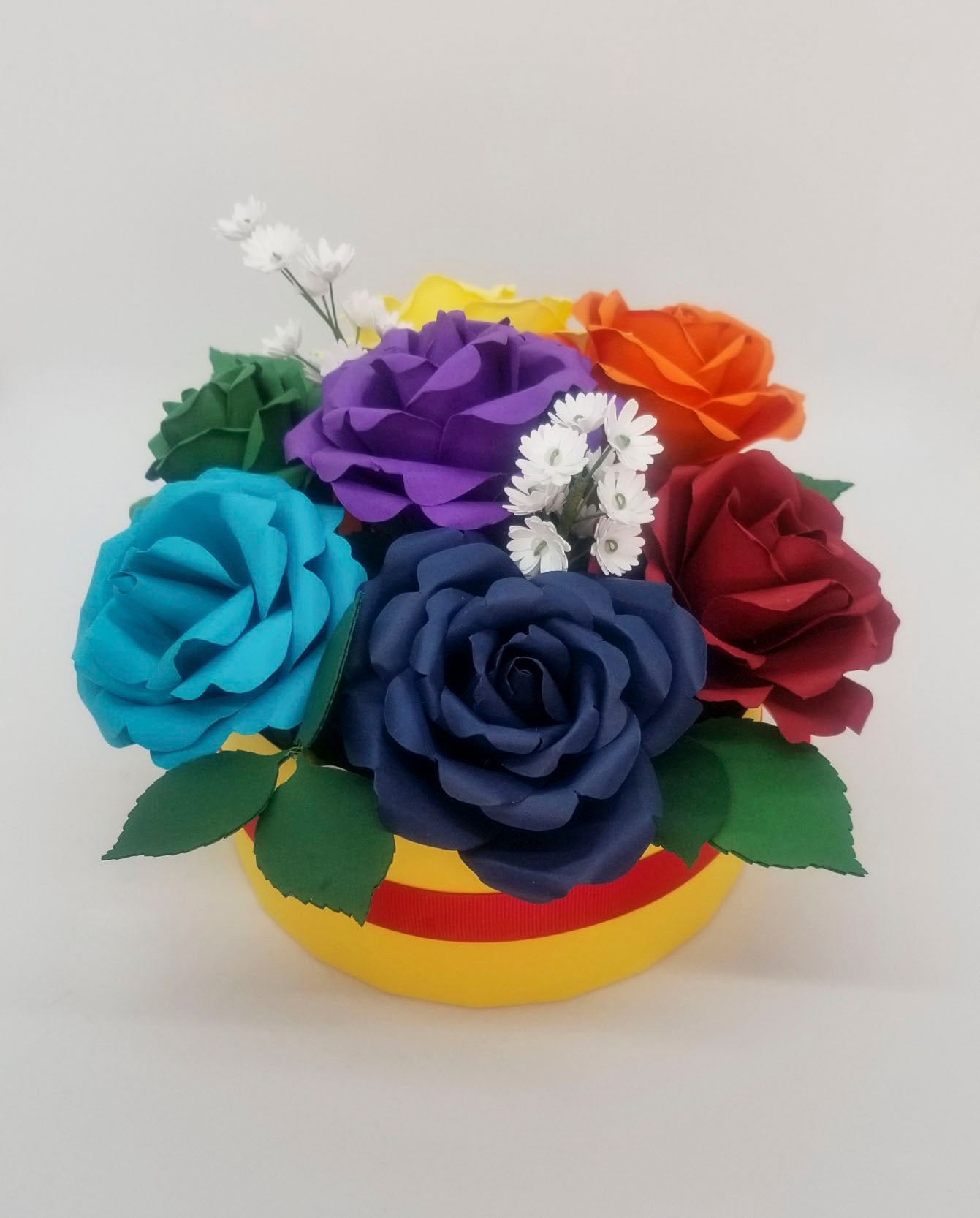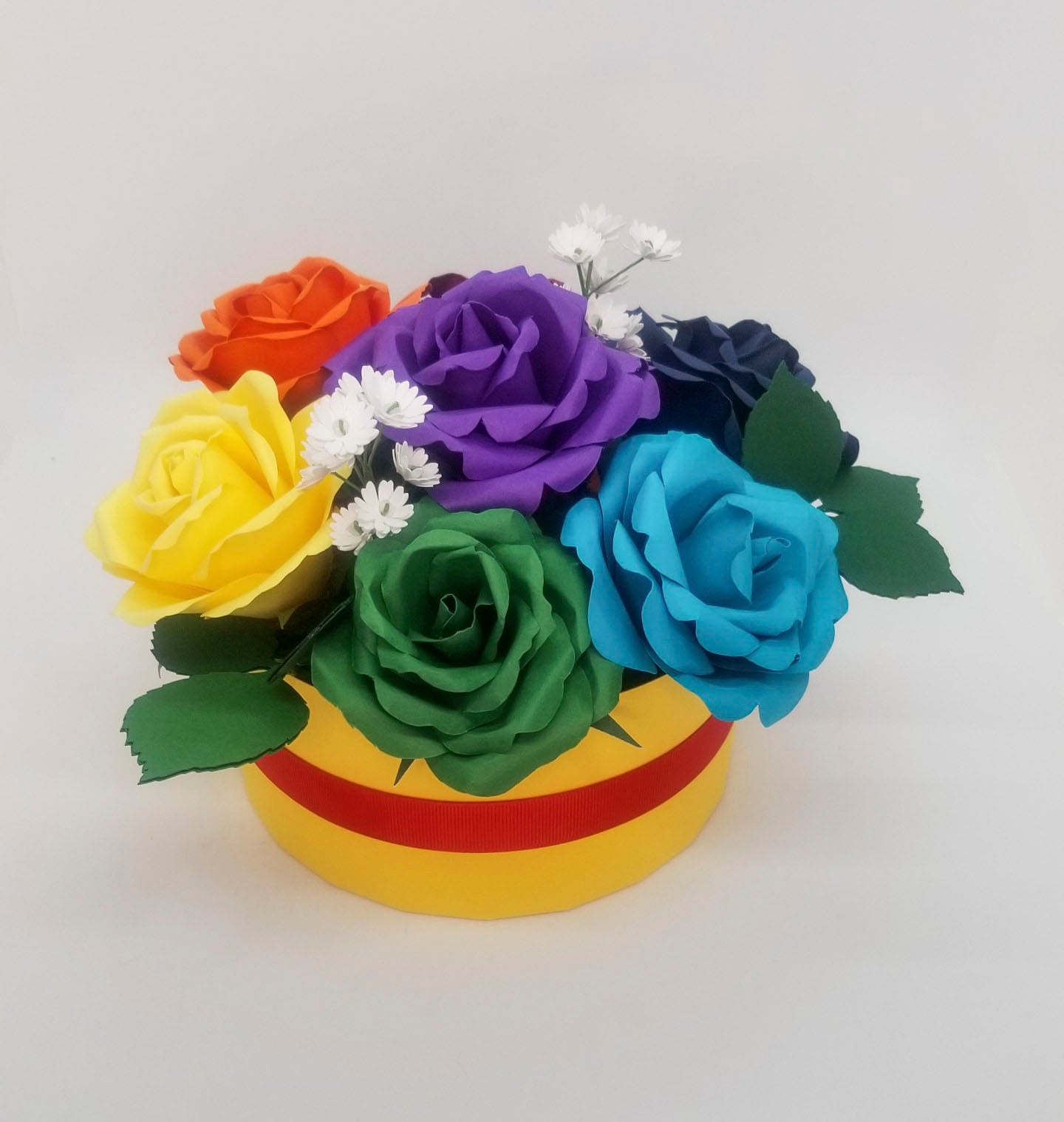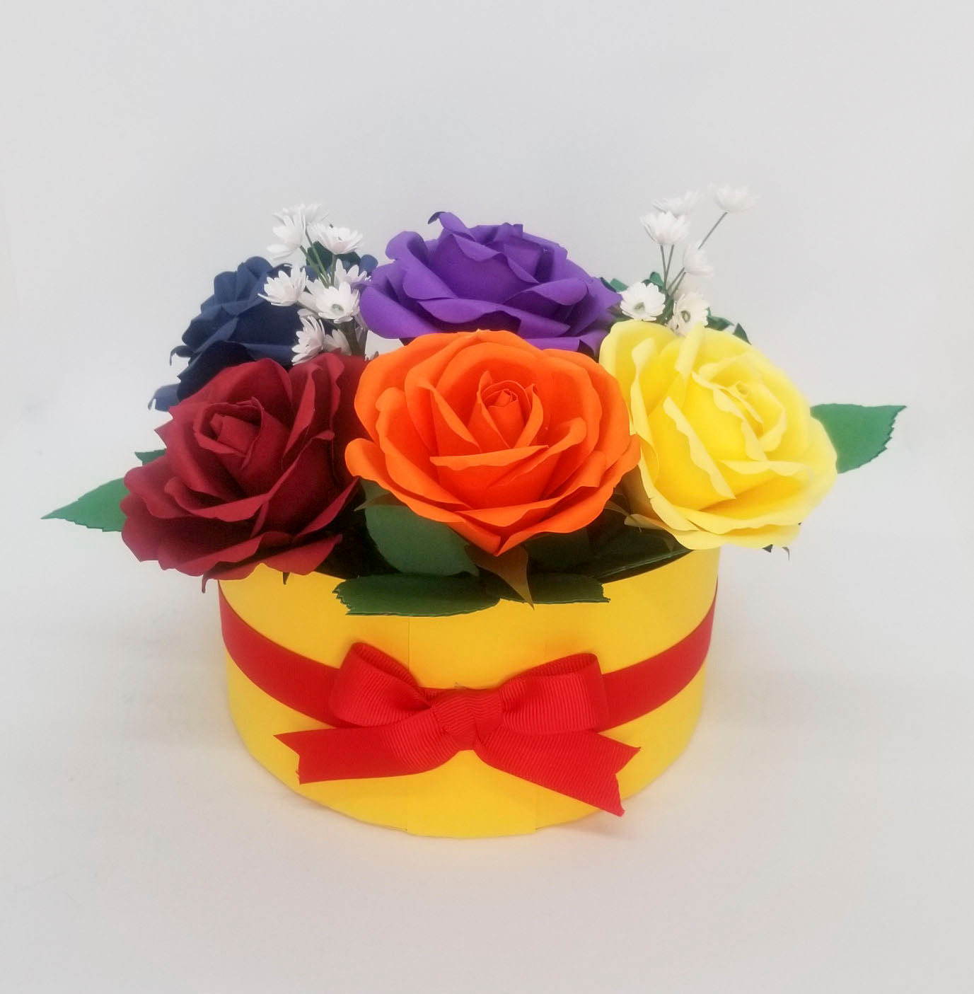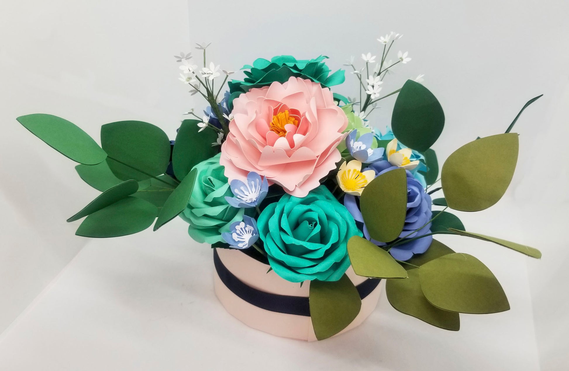 A small & beautiful paper flower arrangement in a handmade box style. It is a perfect any occasions, decorations, centrepieces, a gift to love ones or just for the home. If you want to customize the colors of the flowers, This is the right site that you entered :) It has 5 big paper roses, 1 peony, baby breath with eucalyptus leaves.