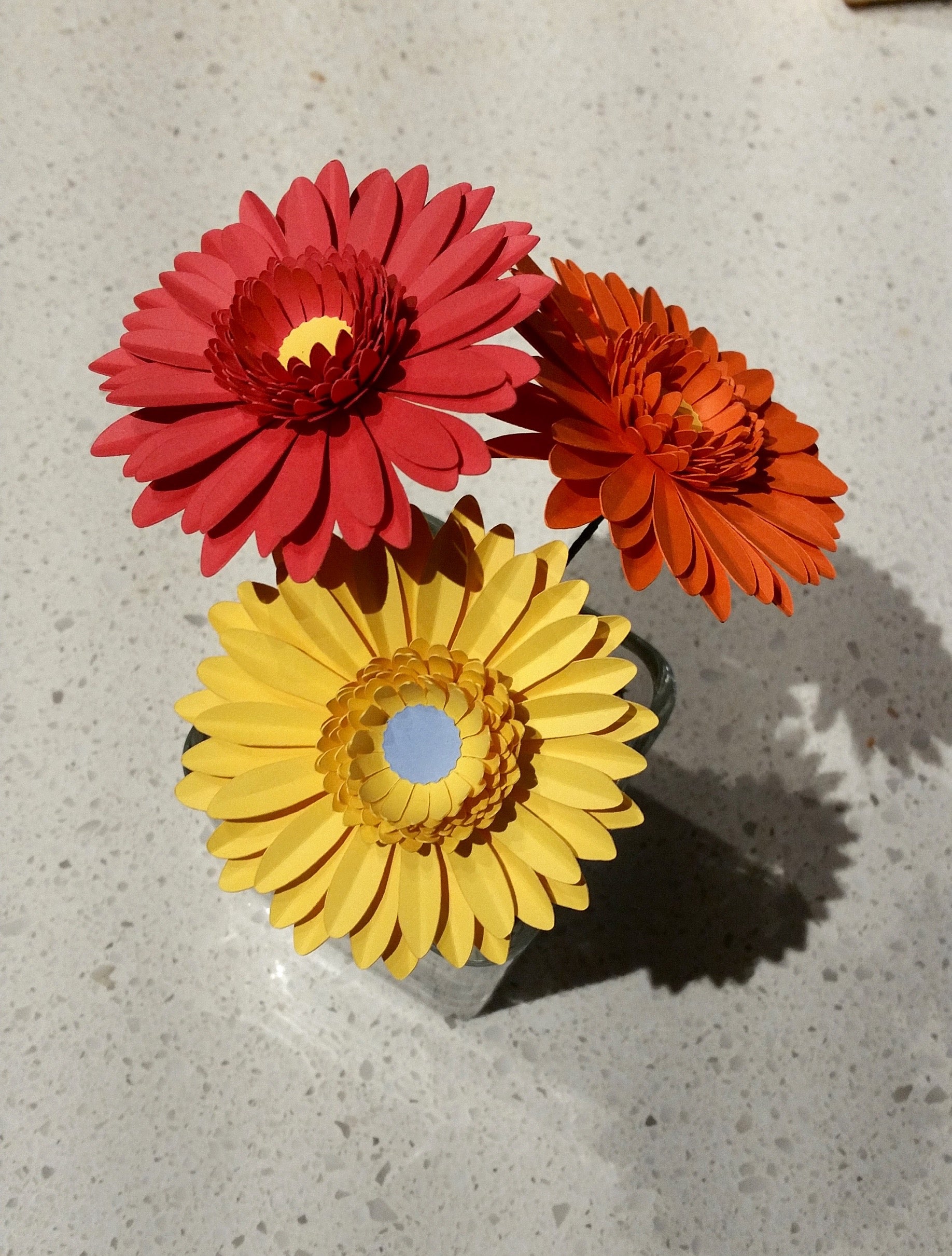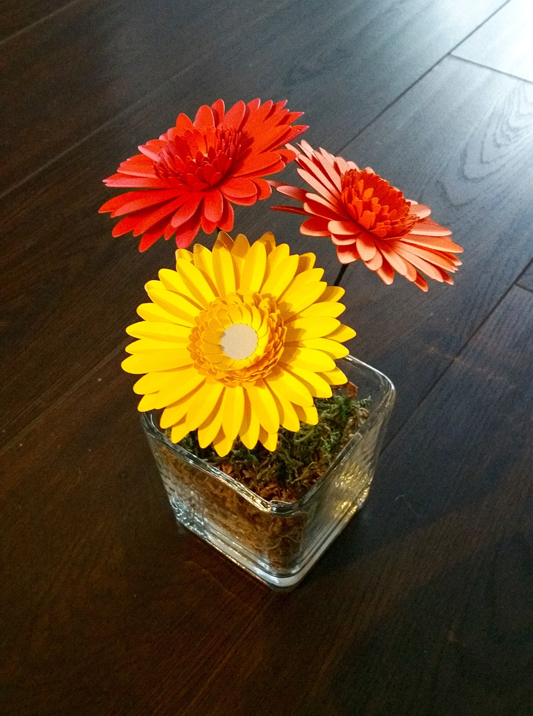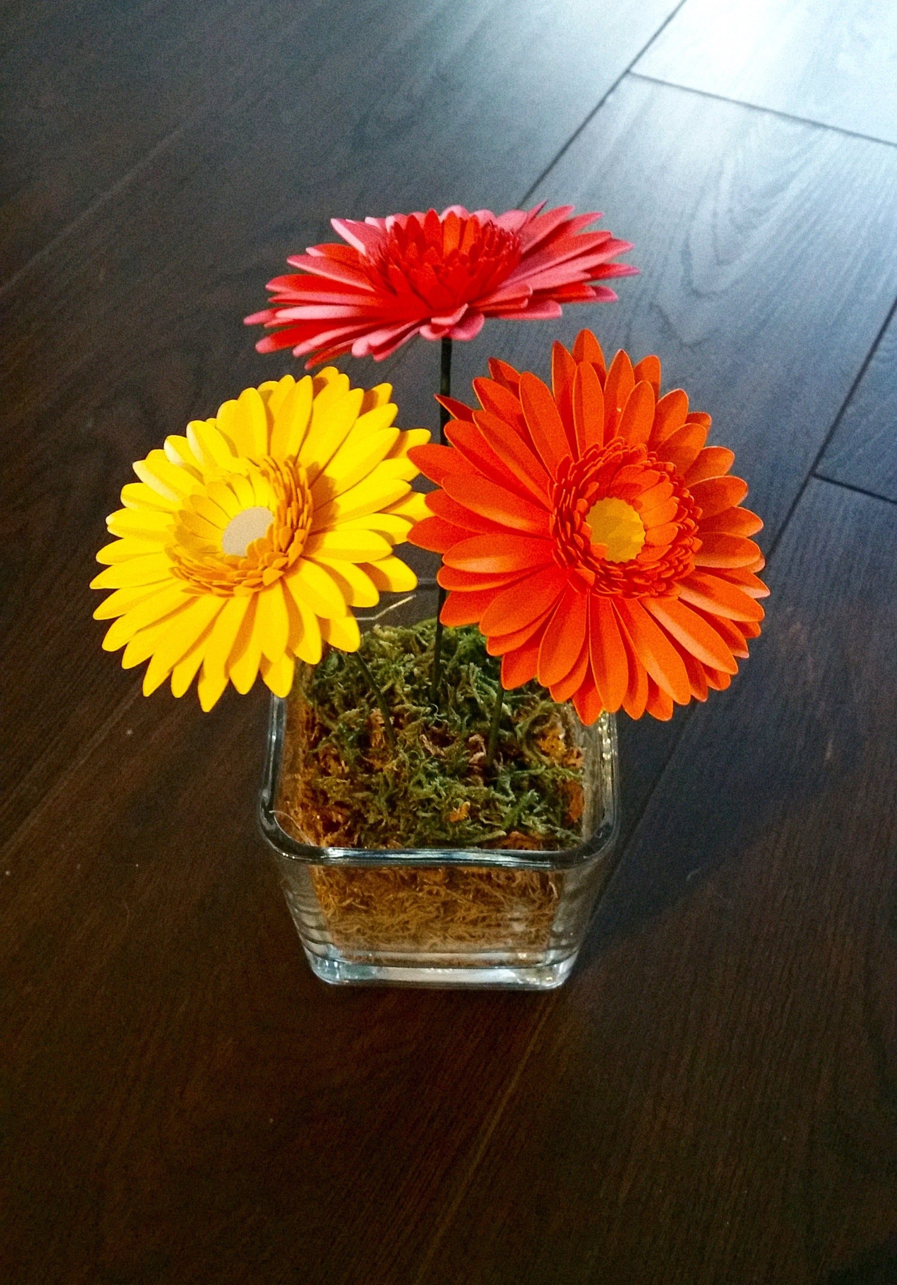 A beautiful paper Daisy flowers in a glass/clay pot. It is a perfect any occasions, decorations, centrepieces, a gift to love ones or just for the home. If you want to customize the colors of the flowers, please contact us for the specific color. It has 3 paper daisy flower and comes with a clay pot.