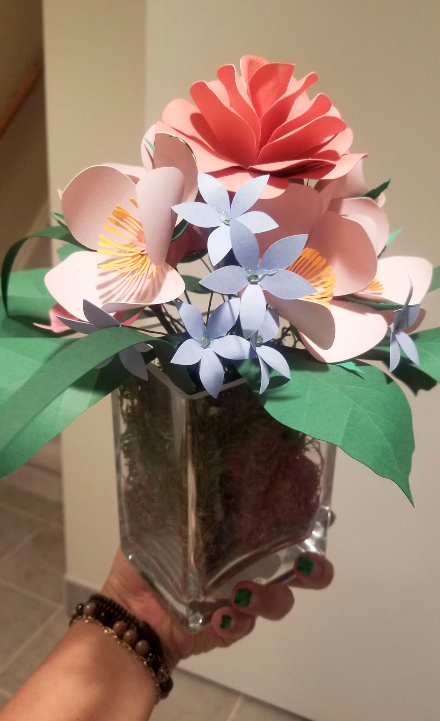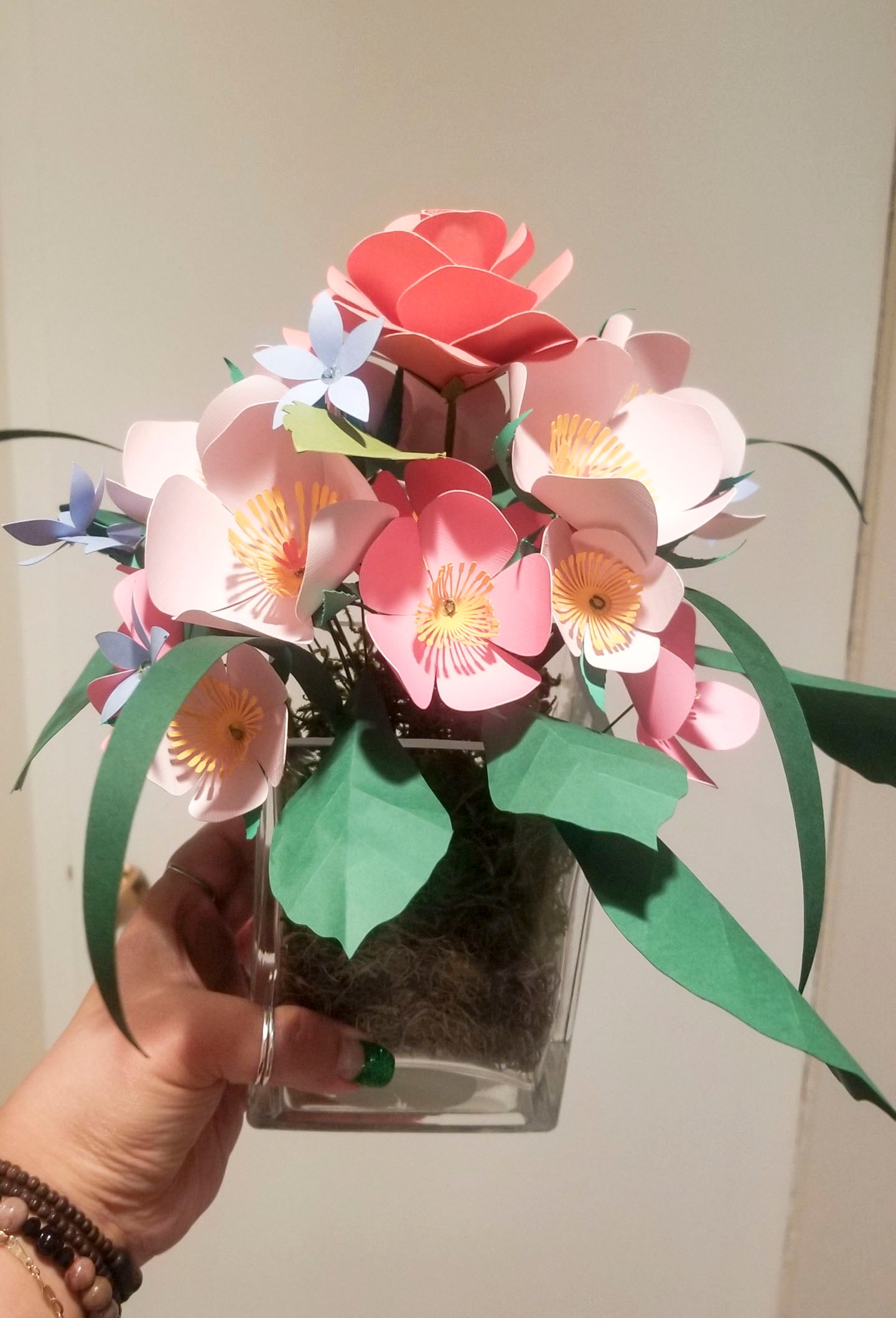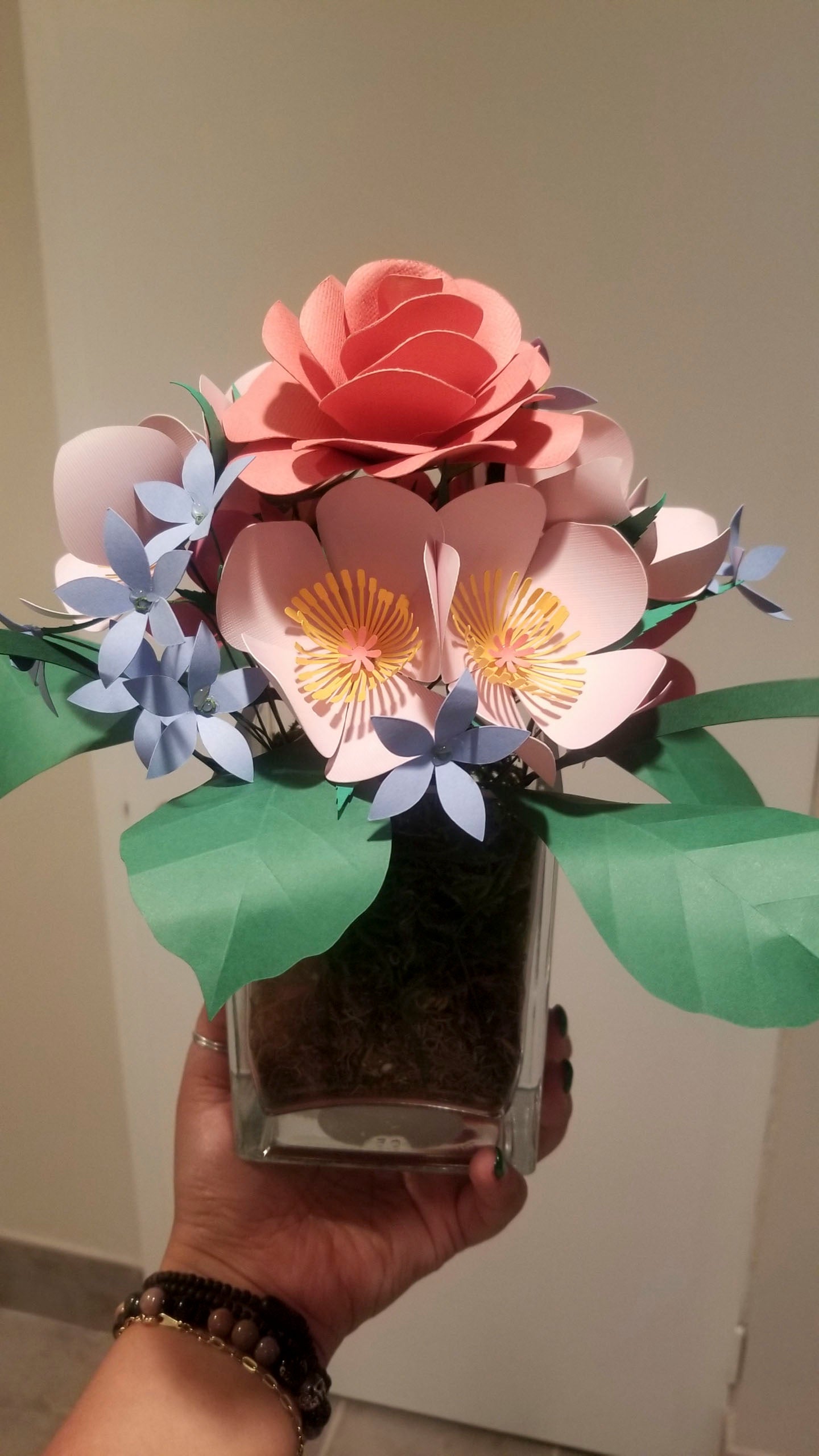 A beautiful small paper flower arrangement style. It is a perfect any occasions, decorations, centrepieces, a gift to love ones or just for the home. If you want to customize the colors of the flowers, please contact us for the specific color.